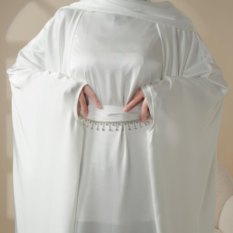 - Set Includes: Open Abaya Longsleeve Inner Dress Matching Belt with Diamond Tassel Attached Niqab with Diamond Tassel